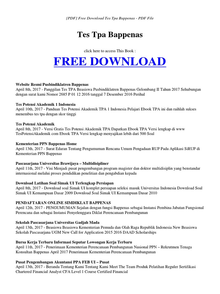 Free Program Contoh Soal Tpa Bappenas S2 Pdf Writer Bestvfiles from bestvfiles691.weebly.com Maybe you would like to learn more about one of these? Check spelling or type a new query. Buku tpa oto bappenas pdf. We did not find results for: