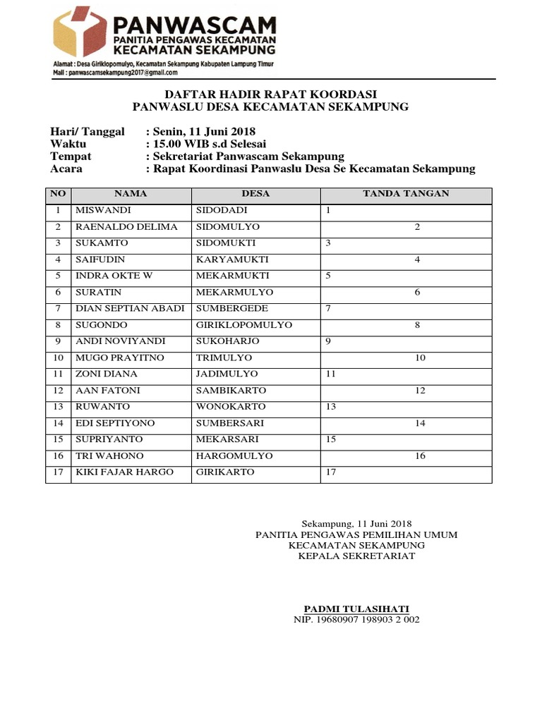 Check spelling or type a new query. We did not find results for: Maybe you would like to learn more about one of these? Daftar presensi atau daftar hadir rapat berisi.