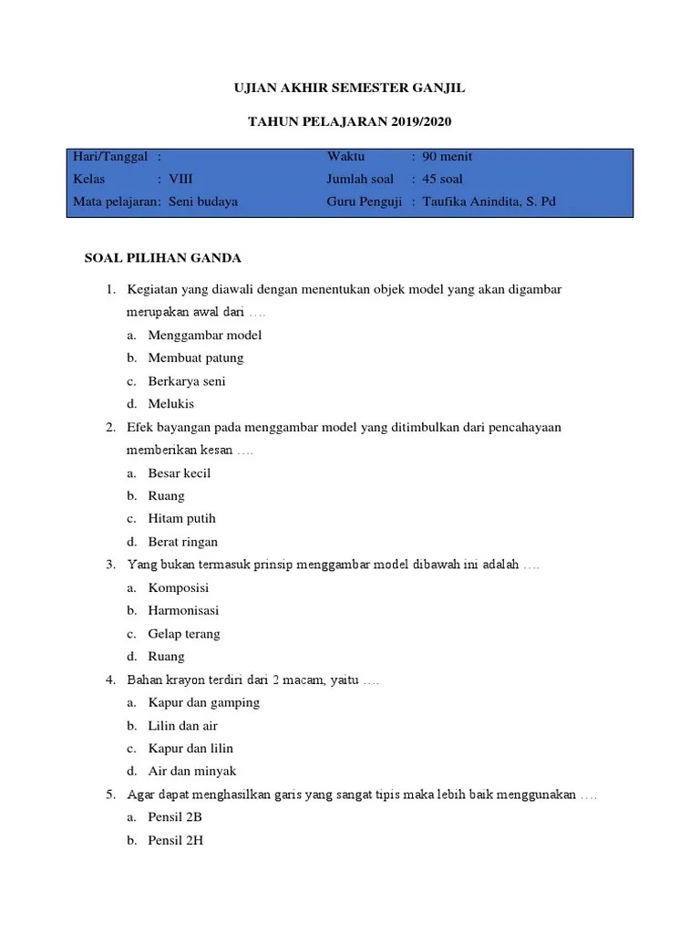 Proses terakhir dalam membuat batik adalah… Contoh soal seni budaya kelas 8 semester 1 dan semester 2. Seni pantomim merupakan pertunjukan teater yang menggunakan bahasa: No, kompetensi inti, kompetensi dasar, materi, indikator pe, bentuksoal, no soal. 28092020 untuk membantu anda memahami lebih mudah materi drama tersebut anda .